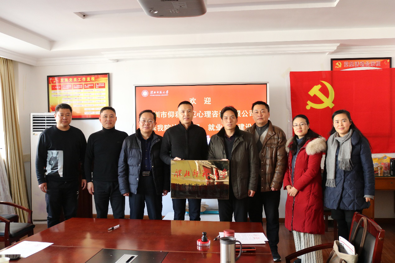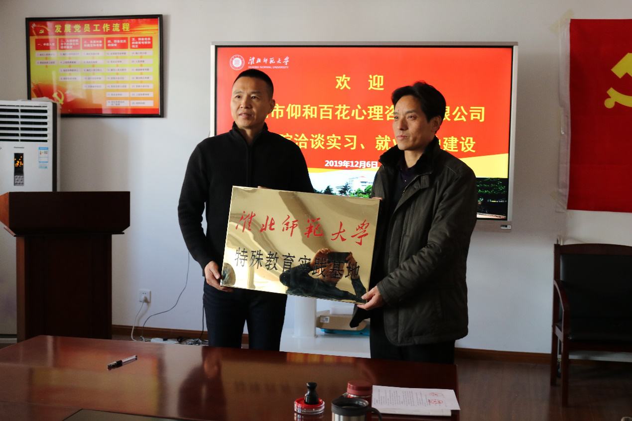 12月6日下午,教育学院与深圳市仰和百花心理咨询有限公司“特殊教育实践基地”签约授牌仪式在滨湖校区特教楼A306会议室举行。教育学院党委书记毛自鹏、副院长张坤颖、副书记鹿荣建、特殊教育系主任蔺红春与副主任阎乃胜参加了会议。