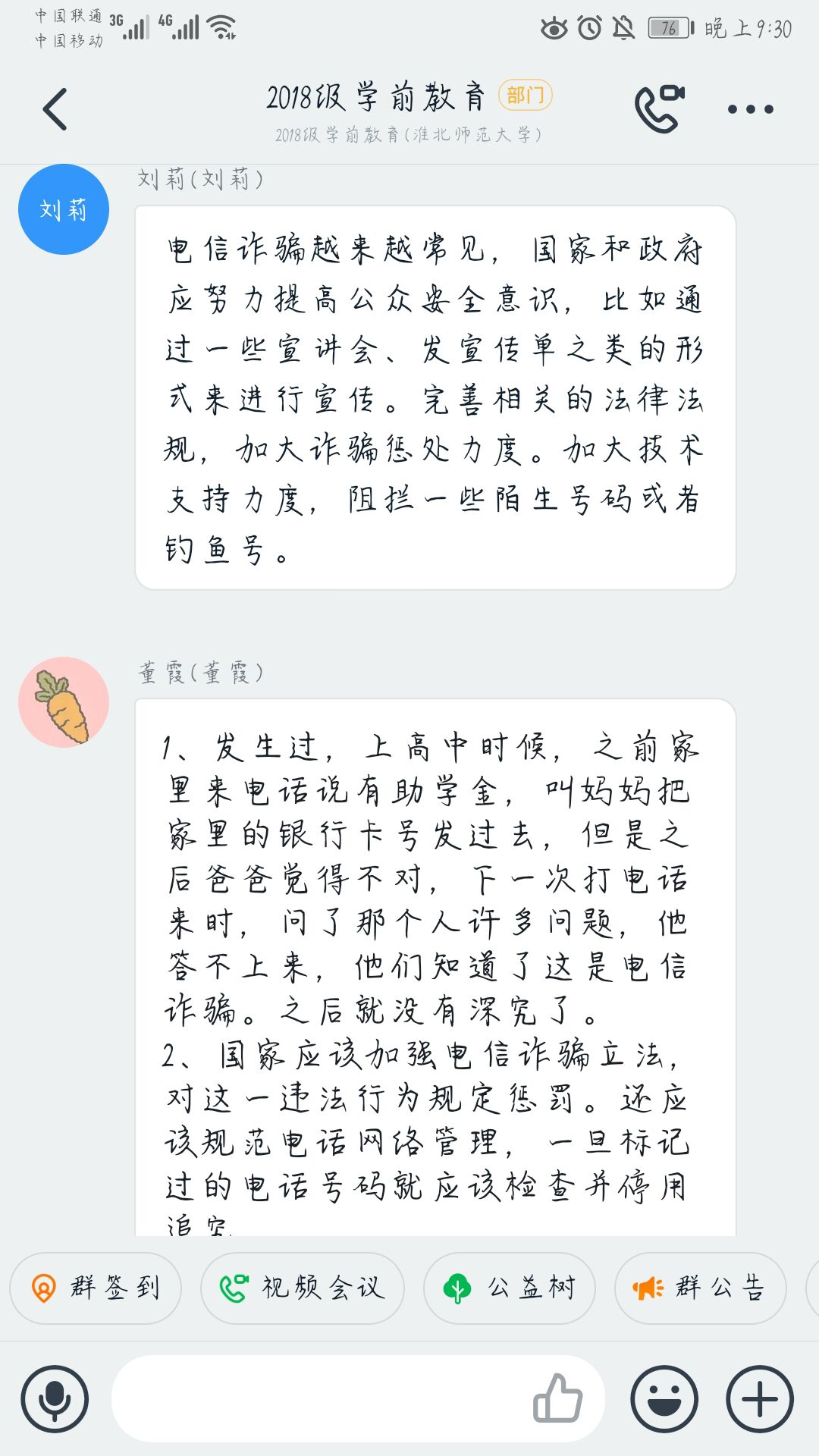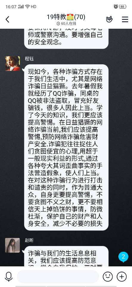 2017级教育技术专业通过问题抢答的方式,组织同学们进行了由公安部刑侦局发布的《2020年全民防骗试题》的测试,在调动同学答题积极性的同时,进一步强化防骗意识。2018级学前教育专业通过线上主题班会的方式,向同学们宣传防骗知识,邀请同学们结合自身经历“云”分享了防诈骗的经验教训,并共同探讨了有效打击电信诈骗的可行性政策方案。2019级特殊教育专业组织同学们进行了反诈骗知识的学习及线上答题,采取线上讨论的方式分享防诈骗知识学习的感悟。2019级教育技术专业则通过QQ平台,将自己的防诈骗心得体会分享至QQ空间,呼吁身边的人共同防范电信诈骗。