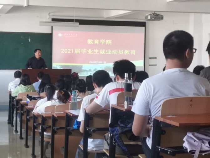 为贯彻落实党中央“稳就业”“保就业”的决策部署,进一步做好2021届毕业生就业工作,促进毕业生早就业、就好业,9月11日下午,教育学院在特教楼举办了2021届毕业生就业动员教育大会。校创新创业学院院长、就业指导中心副主任李雨奎,就业指导中心就业管理科科长杜飞,学院党委副书记鹿荣建,毕业班辅导员及2021届全体毕业生参加会议。会议由鹿荣建主持。