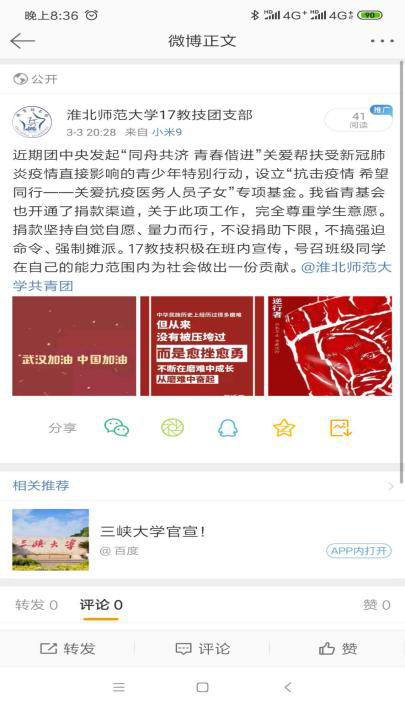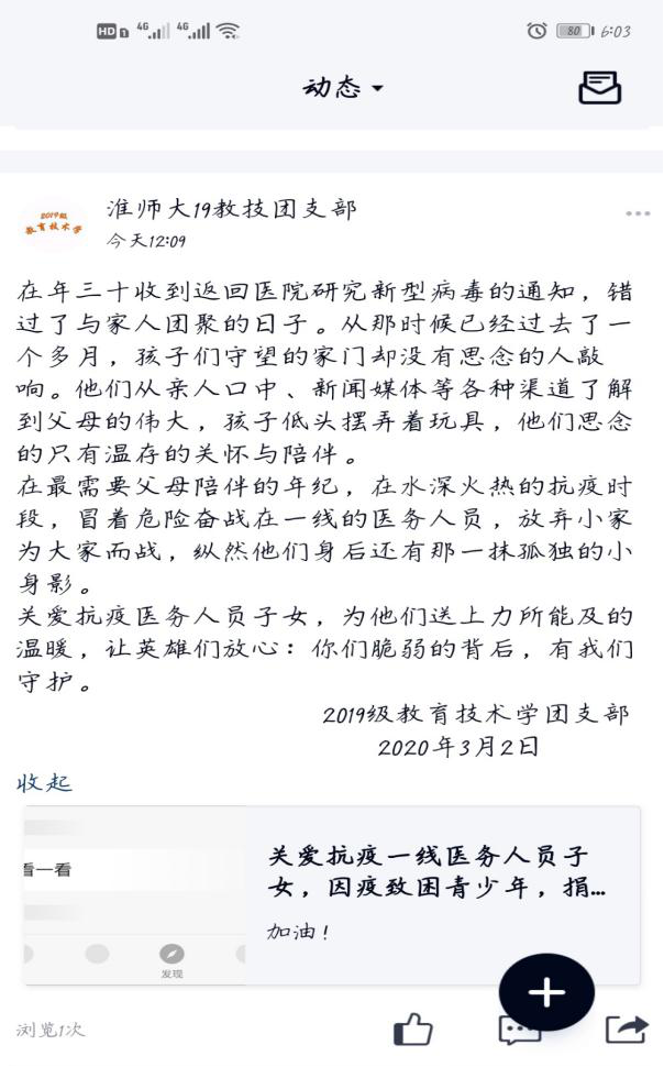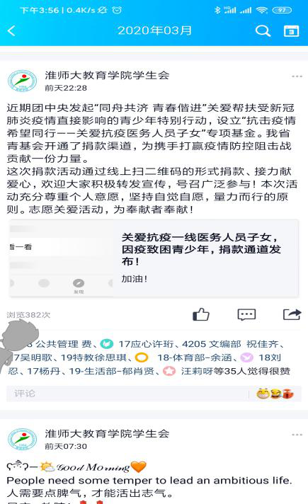 淮北师范大学教育学院团委响应号召,积极动员班级、社团等团支部依托团学组织新媒体等渠道,发动广大学生团员根据自身情况自愿参加献爱心活动。我院共19个团支部积极展开宣传,利用官Q空间推送、微博、班群推文等方式对此次献爱心捐款活动进行了宣传,希望可以为防疫工作贡献一份力。