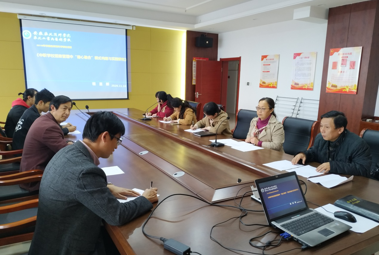 11月18日下午,教育学院赵小云教授应淮北工业与艺术学校邀请,在综合楼12楼会议室召开了安徽省教育科研项目(JK19084)课题中期检查暨阶段总结研讨会。会议由淮北工业与艺术学校教科研处何大学主任主持,分管领导王本新副校长、心理健康教育中心主任程显新、学校政史教研组组长王育红、人文艺术系学生科长冯学莉、学生科干事刘源源、淮北师范大学心理系主任赵小云教授、淮北师范大学心理系3位应用心理专业硕士研究生等参加了会议。