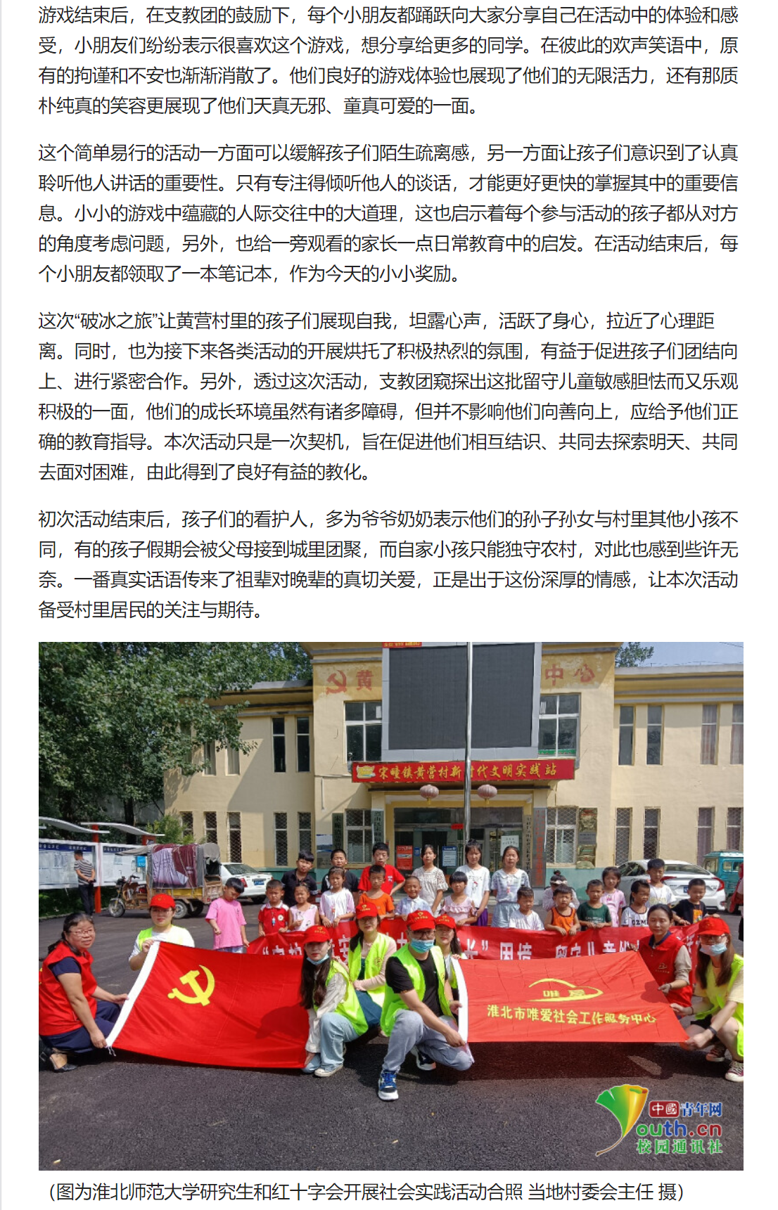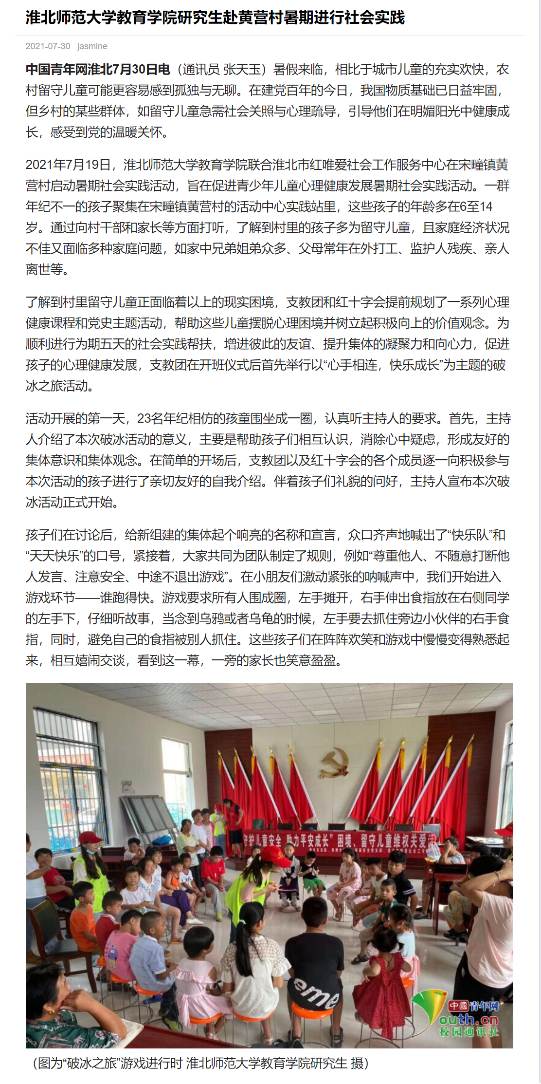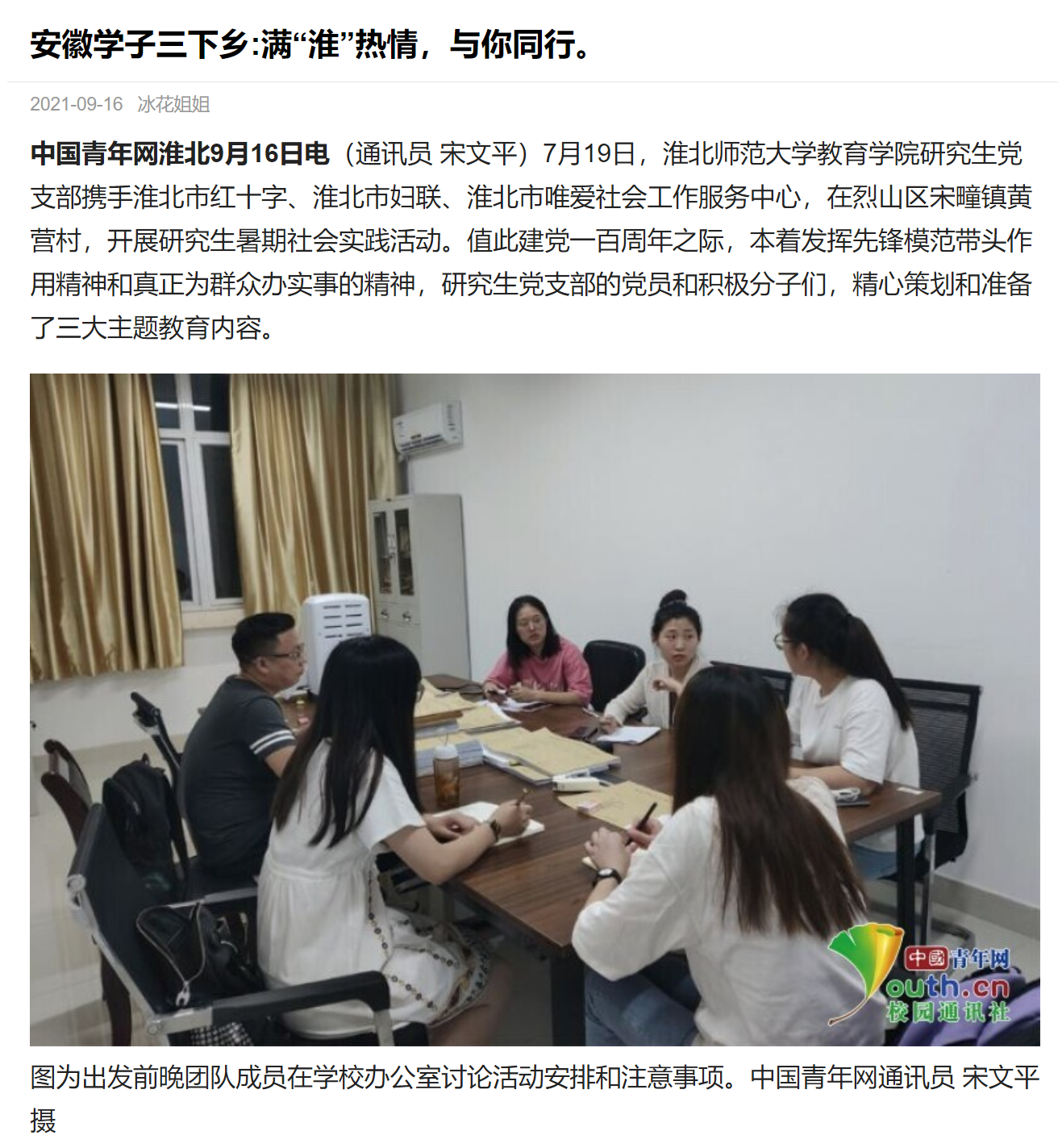 7月30日,中青网报道淮北师范大学教育学院研究生赴黄营村暑期进行社会实践。