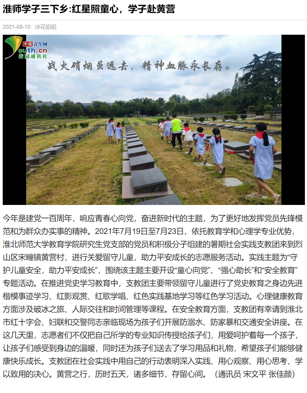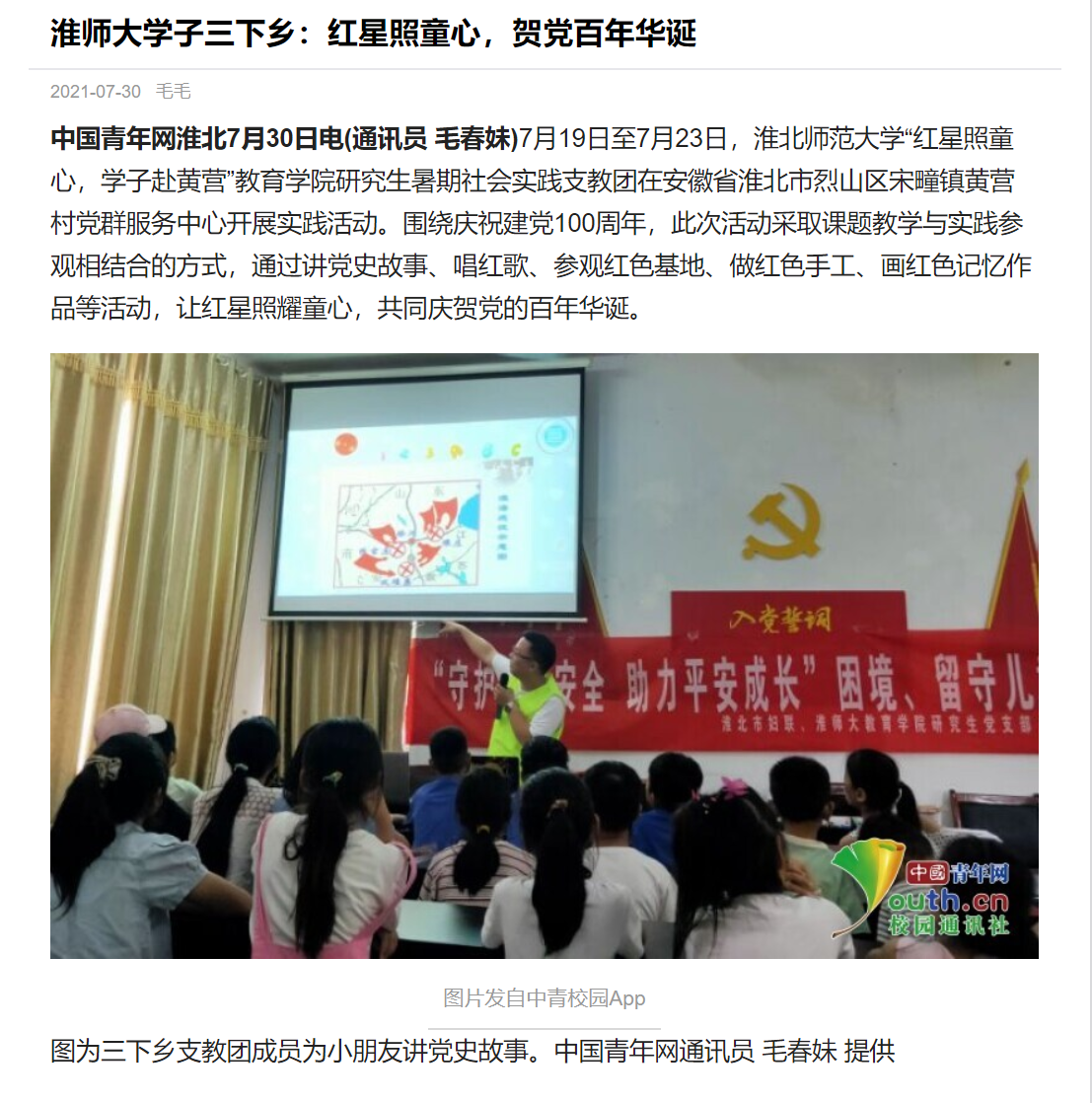 7月30日,中青网报道淮师大学子三下乡:红星照童心,贺党百年华诞。