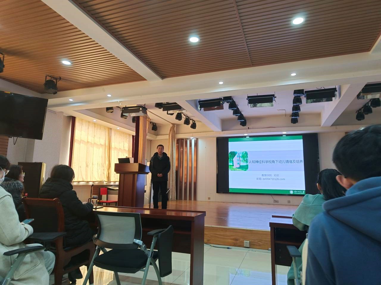 报告会上,邓欢博士结合自身的实践经验和研究成果,理论联系实际,通过三方面向大家讲解了认知神经科学视角下幼儿情绪及培养。首先对情绪的基本概念及其神经机制做了介绍。同学们对情绪概念有了重新认识,学会从主观体验、生理唤醒和外在表现三方面来把握和理解情绪。其次讲述了幼儿情绪的特点及其神经机制,强调幼儿阶段是行为共情发展的重要时期。接着,邓欢博士就幼儿情绪的培养给出认知神经科学视角下的调节策略,分别为做情绪健康的家长、加强生活中对情绪的强化、注意早期生活应激和重视社会经济地位的影响。最后,邓欢博士呼吁大家避免神话认知神经,学院副院长张坤颖对邓欢博士的学术报告作了总结。