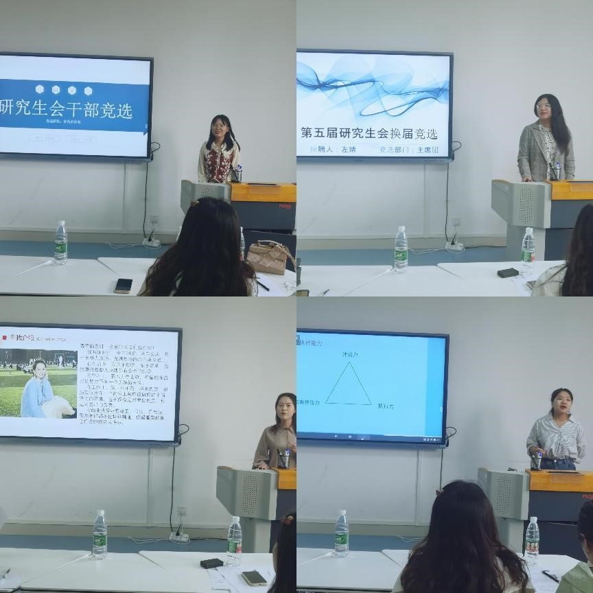 来自学院2021级各专业的12位同学参加第五届干部换届的竞选活动。本次换届采用线上线下结合的方法,并借助腾讯会议、钉钉等网络工具,通过演讲和现场答辩、无记名投票的形式进行。第四届研究生会主席韩璐主持本次会议,她详细宣读了本次换届竞选的要求和流程,并对这一年来辛苦工作的研究生会成员表示感谢。参加竞选的同学按照不同部门依次发表演讲,她们以自信的姿态和各具特色的表现赢得了在场人员的阵阵掌声,充分展示了学院研究生良好的精神风貌。演讲结束后,研究生会主席团以及各部门部长对候选人进行提问,进一步考察候选人的组织协调能力及应变能力。秉承民主公正公平的原则,全体候选人竞选展示结束后,根据投票结果,选举产生新一届主席团成员及各部门负责人。
